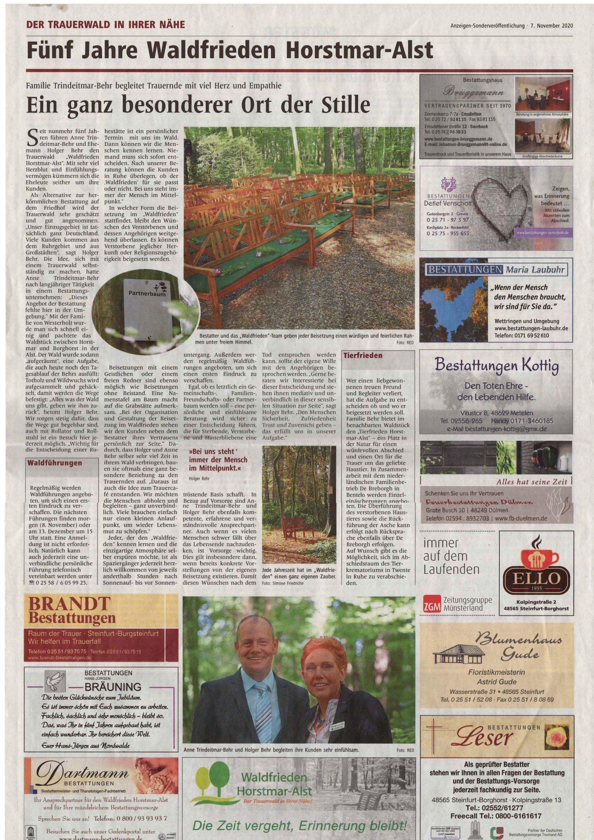 Nutzen Sie unsere Termine einer Waldführung und lernen Sie den "Waldfrieden Horstmar-Alst" persönlich kennen. Gleichzeitig haben Sie die Möglichkeit, sich eingehend über eine Reservierung/Erwerb des Nutzungsrechtes "Ihres" Baumes zu informieren.